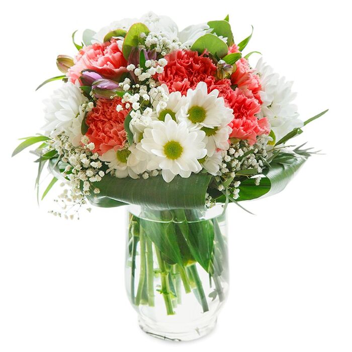Illuminate any occasion with our radiant flower arrangement. This stunning bouquet features a delightful mix of snow-white chrysanthemums, airy gypsophila, and light pink carnations, beautifully intertwined with vibrant aspidistra leaves for an elegant finish.